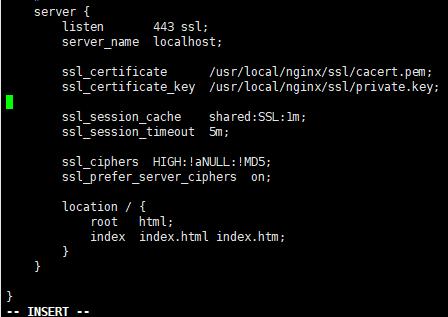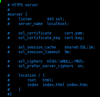 vim nginx.conf编辑该文件,输入i从预览模式进入编辑模式,光标向下移动是可以看到HTTPS SERVER的配置项的,只不过是被注释了的。
