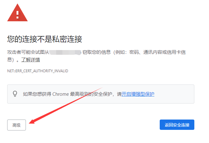 https://你的服务器公网ip地址:端口号,如https://47.98.244.xx/,如果显示下图,可以点击高级后,再点击继续前往xx.xx.xx.xx(不安全)