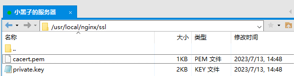 cacert.pem文件和private.key文件上传到ssl文件夹下,并记录下该路径,待会配置nginx.conf配置文件的时候需要使用。