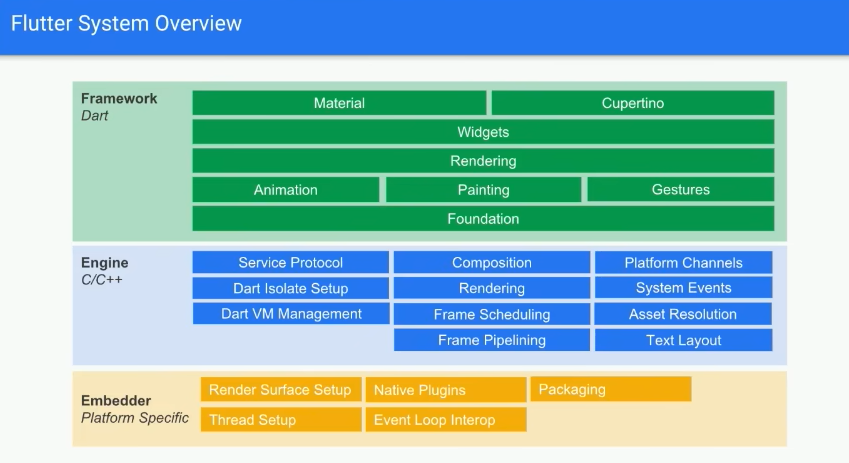 - 底层的嵌入层:由平台对应的语言实现,在安卓上就是Java和C++,在iOS上由Objective-C/Objective-C++实现,嵌入层为Flutter系统提供了一个入口。Flutter系统通过入口访问底层系统提供的服务,比如输入法,绘制surface等。