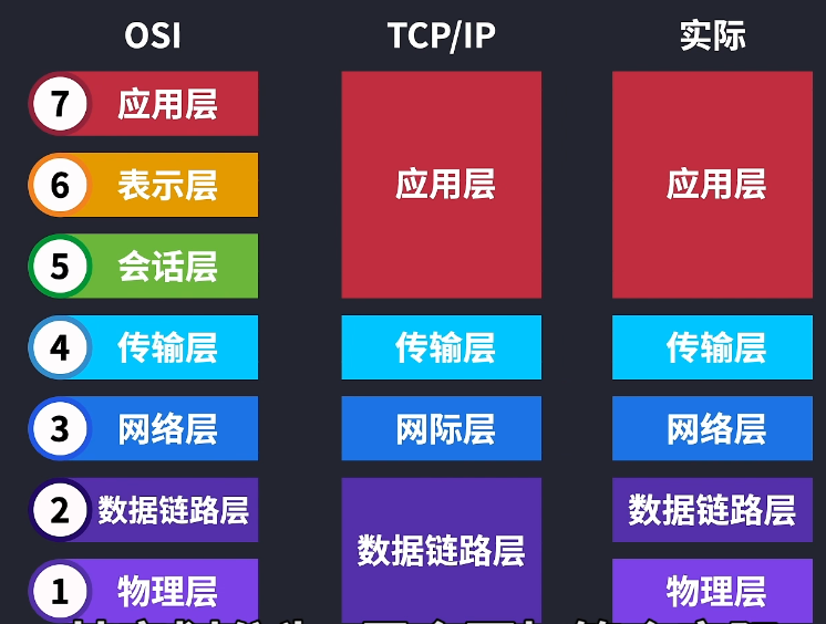 之所以说是参考,因为OSI网络实际中并不使用,我们只是把OSI网络模式作为参考。在网络出现问题的时候,可以从一个宏观的整体去分析和解决问题,而且搭建网络的时候也不并不一定需要划分为七层。 但是当今互联网广泛使用的是TCP/IP网络模型,它原本只有四层,随着人们的不断实践后发现,其实划分为5层会更加符合实际。