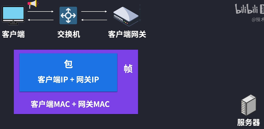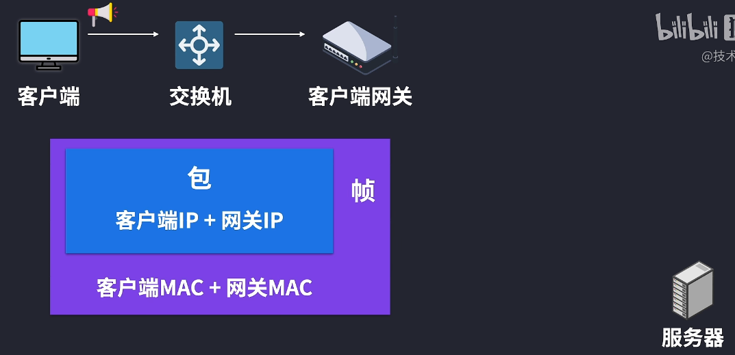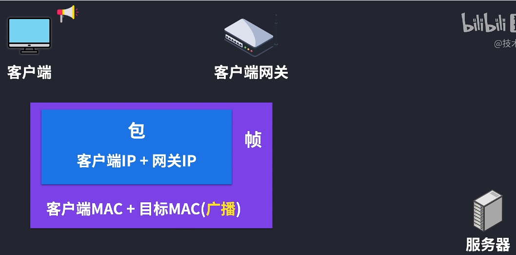 但是客户端主机最初并不知道默认网关的MAC地址,没有办法封装成帧,这个时候就可以用ARP协议来进行广播,找到网关IP对应的MAC地址,把包封装成帧,源MAC地址填自己的,目标MAC地址填广播的地址。